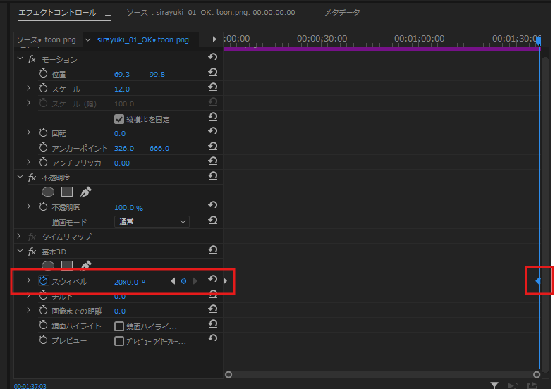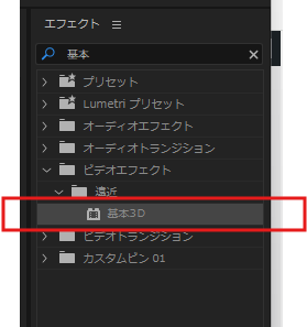 ③Premiere Proに読み込んで、【エフェクト】→基本3Dを適用